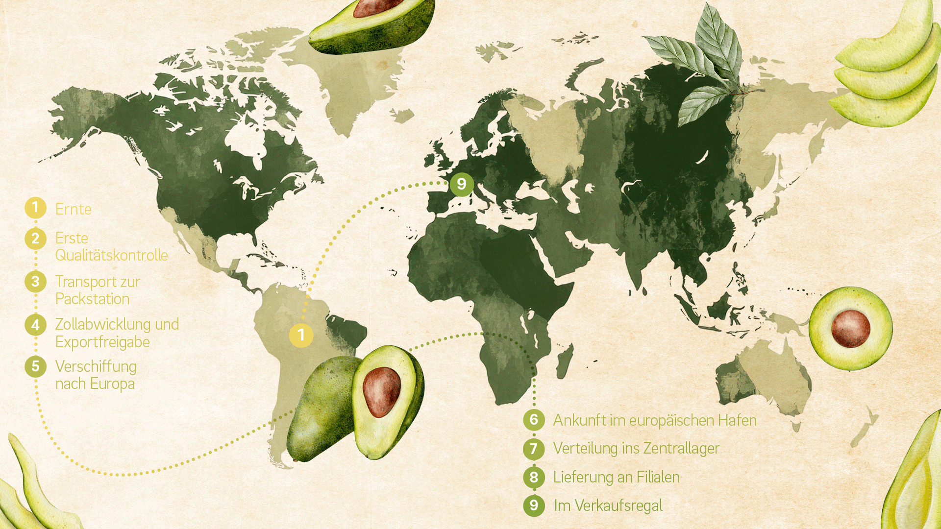 Die Avocado wird unreif geerntet und vor dem Transport nach Europa, meist per Containerschiff, noch gereinigt und behandelt, um sie vor Pilzbefall und anderen Krankheiten zu schützen. Dank Globalisierung und Digitalisierung ist die Transparenz inzwischen sehr hoch. Mittels GPS-Tracking kann das Produkt jederzeit zurückverfolgt werden. Auch die Abfrage des Standortes oder der aktuellen Temperatur sind dank dieser Überwachung jederzeit möglich.