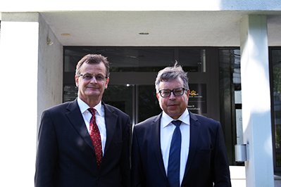 ((Von links nach rechts)) Stefan Bumannn, Dienstelle für Hochschulwesen, und Michael Zurwerra, Rektor der FFHS, anlässlich der Stifterversammlung am 8. Juni 2017 in Brig.
