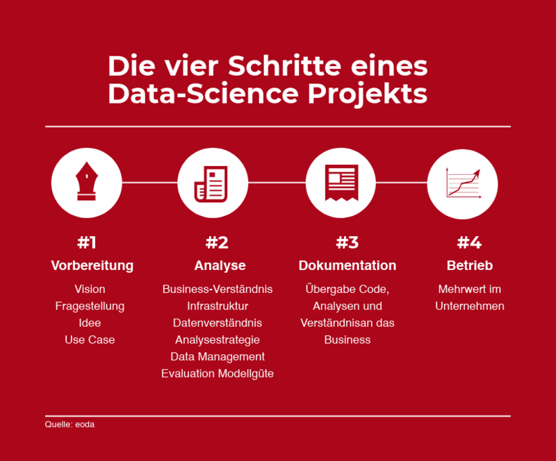 Den Einstieg ins Thema machten Dr. Beatrice Paoli und Dr. Hagen Worch, Forscher an den FFHS-Instituten LWS (Laboratory for Web Science) und IMI (Institut für Management und Innovation). Sie erläuterten anhand von Beispielen wie Data Science für neue Perspektiven sorgen, angepasste Prozesse oder gar neue Geschäftsmodelle hervorbringen kann. Die 4-Step-Methode zeigt allgemein die wichtigsten Schritte, die dabei zu berücksichtigen sind:
