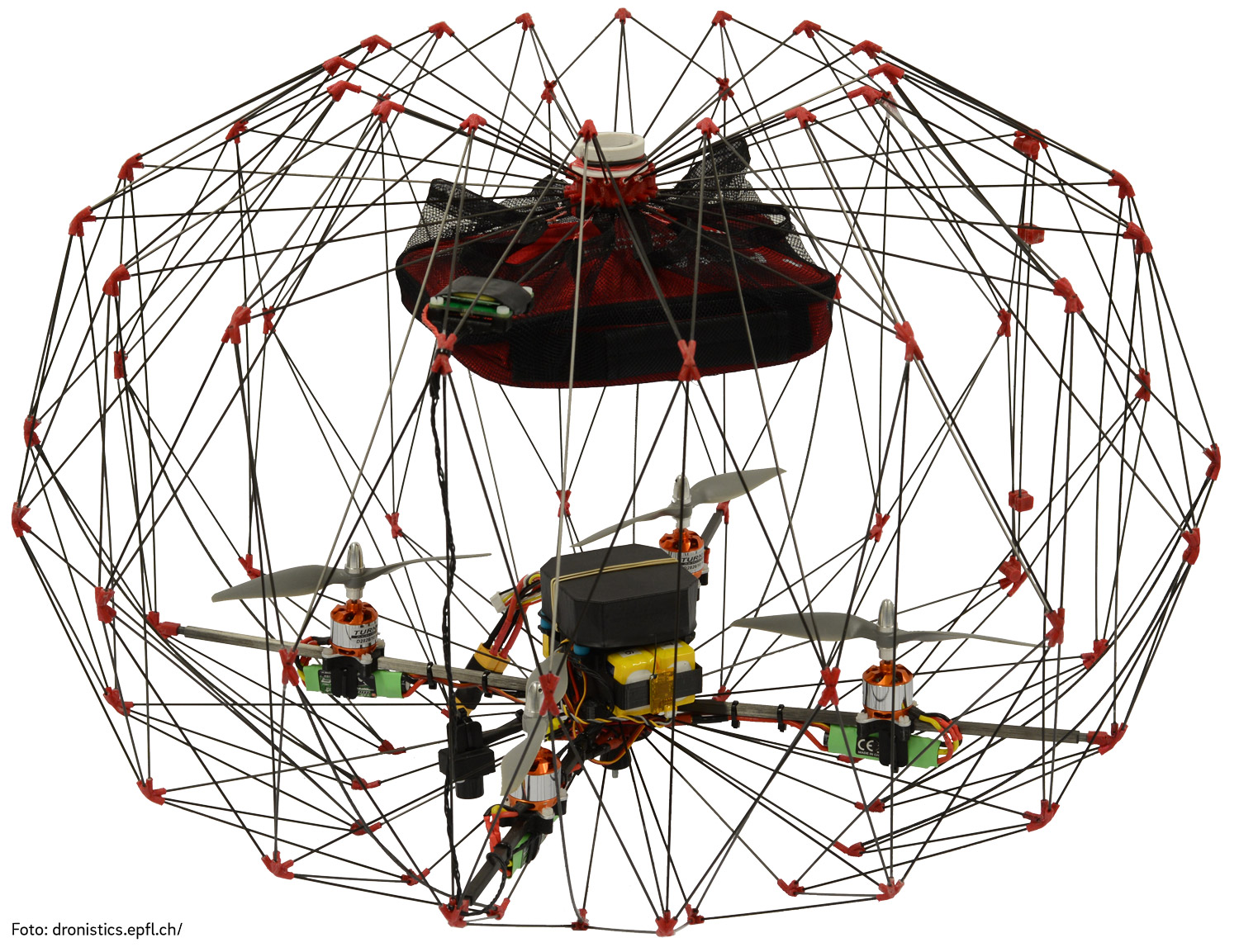 Die Firma Flyability garantiert diesen Sicherheitsbereich nun mit einem neuartigen Käfig, der die Drohne umgibt. Flyability stellt Drohnen her zur Untersuchung von Atomkraftwerken, insbesondere können die Reaktorräume damit untersucht werden, ohne einen Mitarbeiter der radioaktiven Strahlung auszusetzen. Durch die gelieferten Bilder können zum Beispiel Risse in den Wänden, an den Röhren und weitere Defekte erkannt werden.