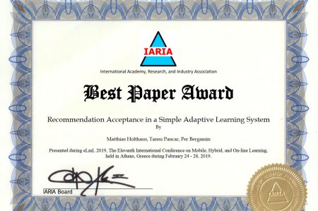Holthaus, M., Pancar, T., Bergamin, P. (2019). Recommendation Acceptance in a Simple Adaptive Learning SystemThe Eleventh International Conference on Mobile, Hybrid, and On-line Learning, eLmL 2019, Athen, Griechenland, 24. – 28. Februar 2019.