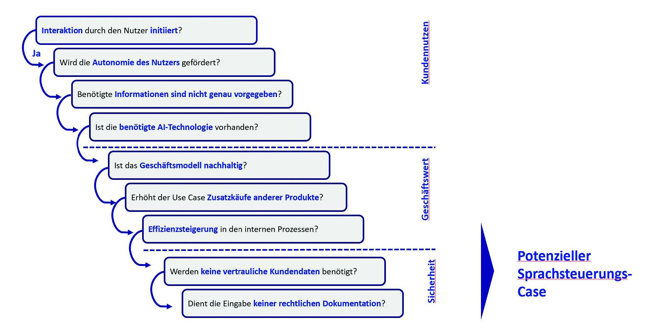 Viele Unternehmen haben dieses Potenzial erkannt und suchen nach Lösungen wie sie ihre Leistungsangebote sprachgesteuert gestalten können und welche Auswirkungen dies auf ihre zukünftigen Produkte und Dienstleistungen haben wird. Dabei gilt es aber zunächst herauszufinden, ob ein vorgesehener Dienst überhaupt sinnvoll sprachgesteuert gestaltet werden kann. Dabei kommen insbesondere die folgenden Aspekte zum Tragen: