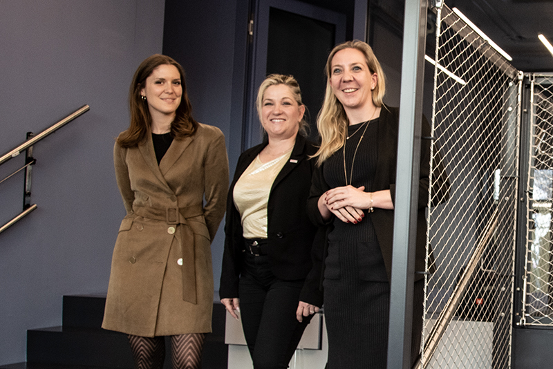 Yvonne Ganz, Departementsleiterin Bau, Real Estate & Facility Managment der FFHS (Mitte) und Projektleiterin Gleisarena zusammen mit Patrizia Dünner, Qualitätssicherung Gleisarena (rechts) und Marianna Maslow, Innenarchitektin (links), beide von Drees & Sommer