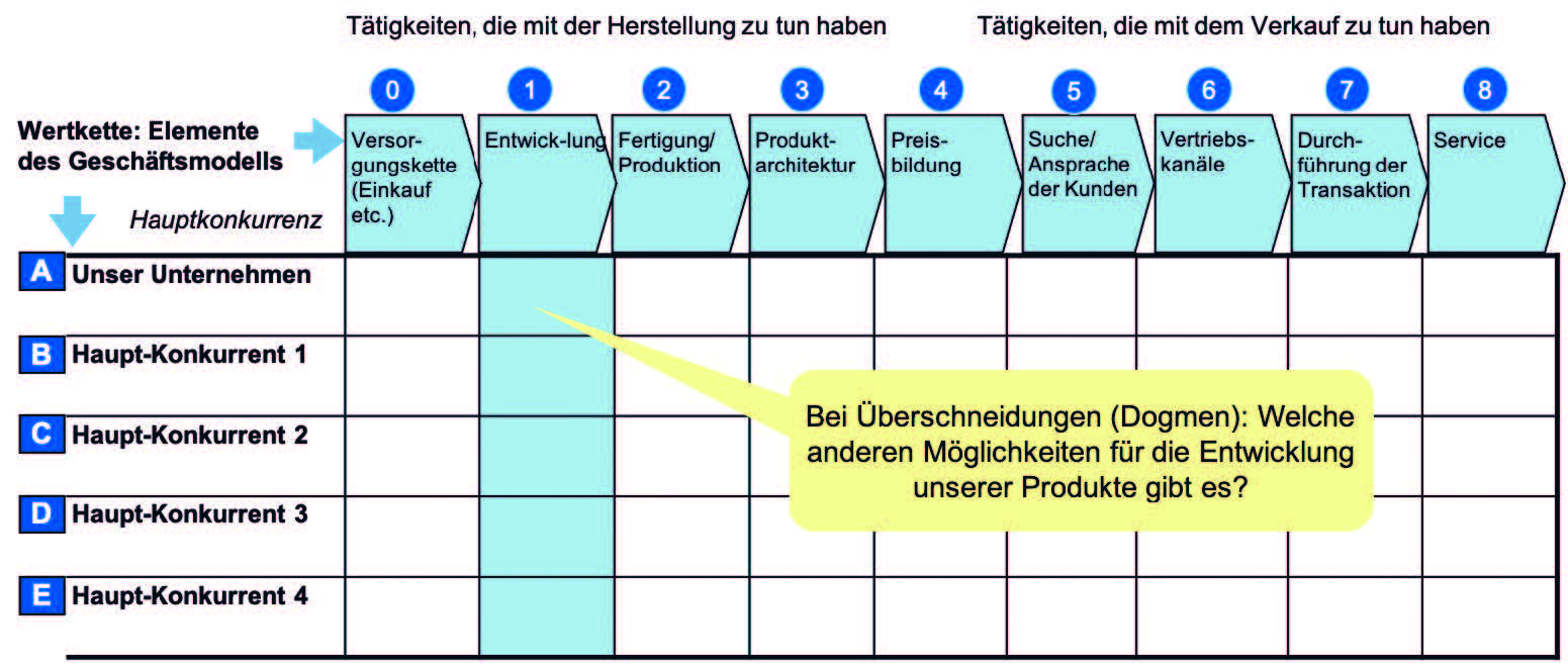 Auch der Erfolg von IKEA begann mit der systematischen Veränderung des Geschäftsmodells im Vergleich zum klassischen Möbelhändler. Das ursprüngliche Aufbrechen von Branchendogmen bestand im Einbezug der Kunden in die Wertschöpfung – Transport und Montage wird vom Kunden selbst übernommen. Eine Methode zur systematischen Identifikation derartiger Potenziale ist die Branchendogmen-Analyse (Abb. 3).