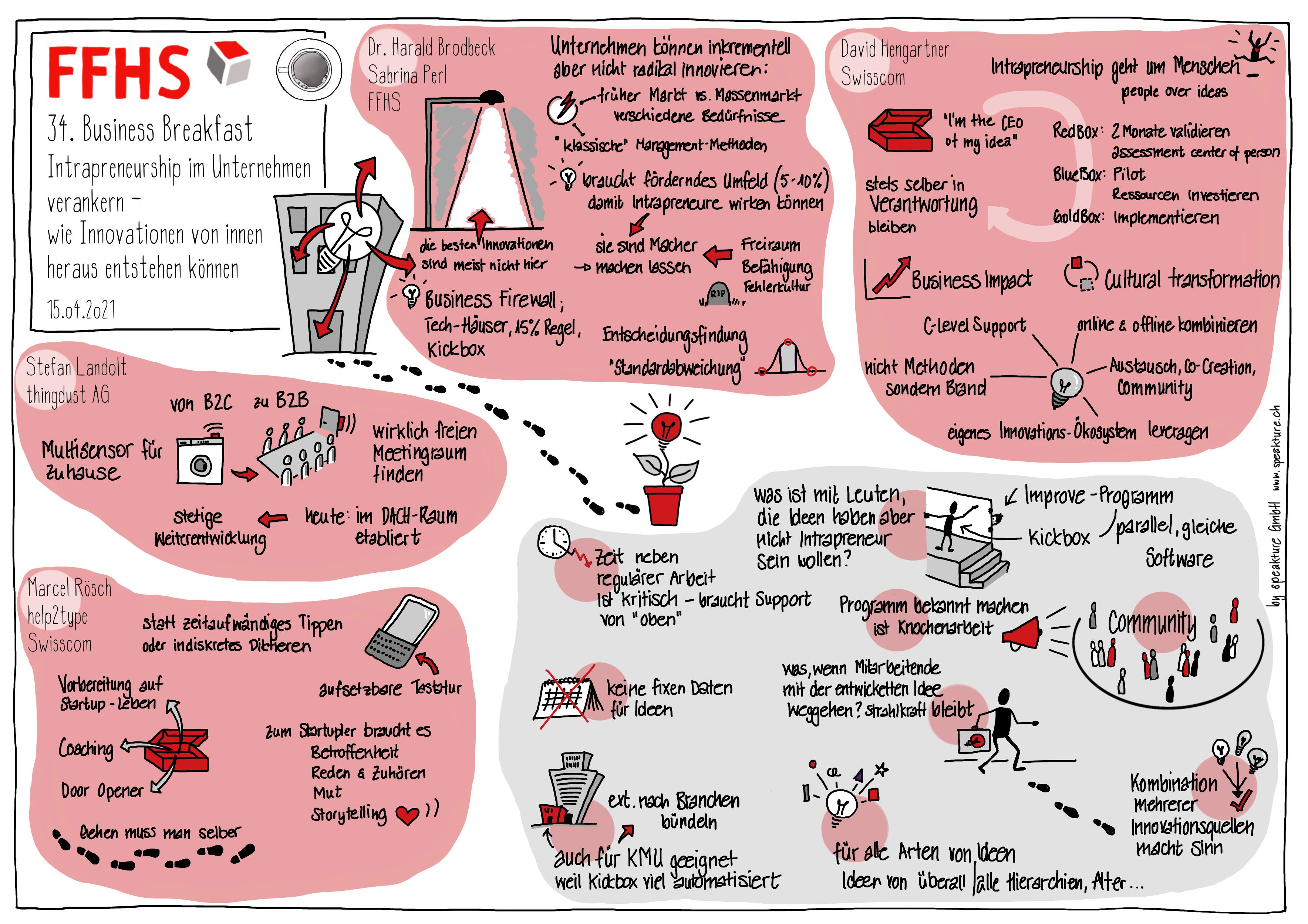 Natürlich gibt es auch Best-Practice-Beispiele. Und natürlich durften diese auch am Business Breakfast nicht fehlen. Ein praxistaugliches Werkzeug wie Unternehmen in der Schweiz ihre intrinsisch motivierten Mitarbeiter zu «Intrapreneuren» entwickeln können, ist die in der Swisscom entwickelte Kickbox-Methode. Jeder Mitarbeitende kann sich mit einer Idee bewerben. In der Kickbox stehen Startguthaben, ein Zeitbudget oder Kontakte zu internen und externen Innovationsexperten zur Verfügung. In einem mehrstufigen Prozess wird dabei die Idee vorangetrieben, vor Jurys gepitcht und im besten Fall für die nächsten Stufen zugelassen.