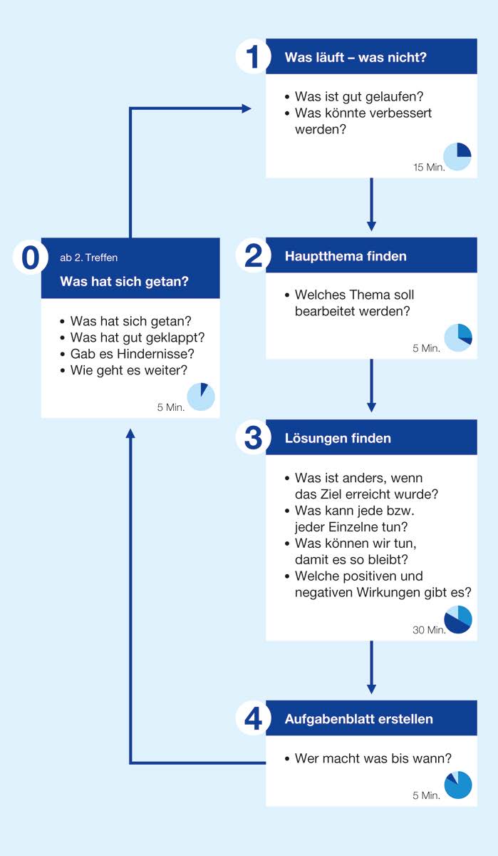 Wie der Ablauf der Ideen-Treffen erfolgen soll. - Bei den Ideen-Treffen werden Lösungen gesucht. Ursachen und «Schuldige» für Probleme sind nicht von Bedeutung. Alle Lösungen, die Sie oder Ihre Beschäftigten weiterbringen, sind wichtig – gleichgültig warum und von wem sie eingebracht wurden.
