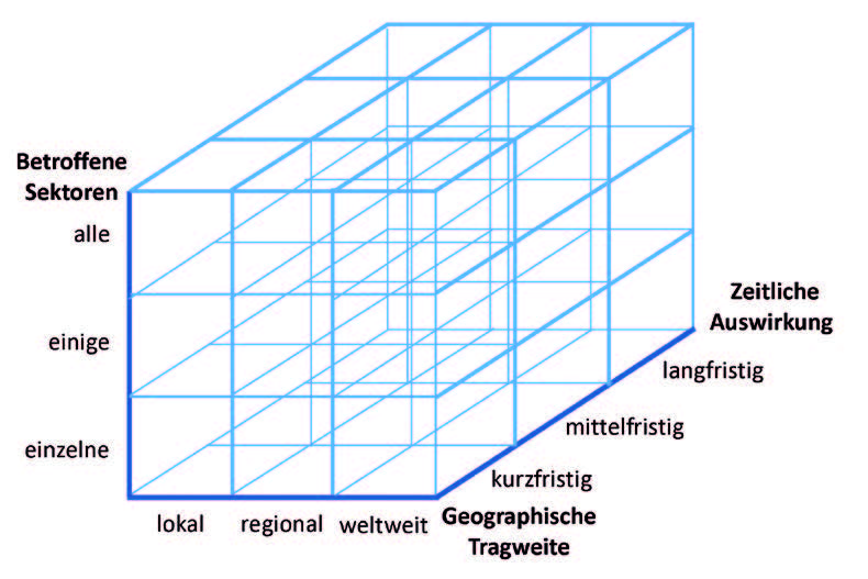 Beginnen wir bei den zwei frontalen Dimensionen. Sie entsprechen jeweils dem geografischen (lokal, regional und global) und dem wirtschaftlichen (einzelne, einige oder alle Branchen) Wirkungsradius von Ereignissen in der Umwelt. Eine feinere Unterteilung der Dimensionen ist durchaus denkbar, indem zum Beispiel die geografische Lage präziser aufgeteilt wird. Für eine Schweizer Unternehmung mit einem natio- nalen Fokus ihrer Geschäftstätigkeit könnten etwa die Kantone oder die Sprachregionen relevante Anhaltspunkte bieten. Darüber hinaus ist es zu empfehlen, namentlich die betroffenen Sektoren beziehungsweise die betroffenen Regionen oder Länder zu nen- nen. Dies erhöht zwar die Komplexität der Darstellung, zugleich jedoch auch die unmittelbare Aussagekraft des Gesamtbildes.