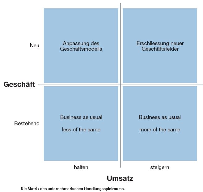 Die Veränderungen in der Umwelt können als Chancen und als Risiken eingestuft werden, die beim Eintreffen zu Bedrohungen mutieren können. Der Spielraum einer Unternehmung lässt sich aber nicht beliebig erweitern. Die geltenden Rahmenbedingungen oder auch die vorhandenen Ressourcen und Fähigkeiten schränken diesen ein. Es ist die Aufgabe der Geschäftsleitung oder des Verwaltungsrats, eine Strategie zu entwickeln, mit der man auf die Zukunft zugeht. Das gilt für unumgängliche Zukunftstrends wie die Di- gitalisierung. Aber eben auch im Hinblick auf einschneidende Ereignisse wie die Corona-Pandemie.