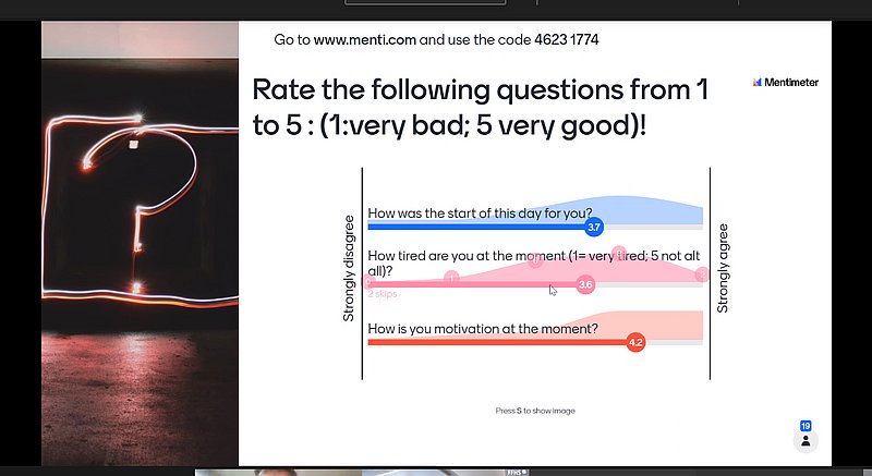 Auch an den beiden weiteren Kurstagen wurden die vermittelten e-didaktischen Grundsätze immer gleich praktisch einbezogen: beispielsweise mit einer Umfrage nach der Befindlichkeit zum Start des Tages. Auf diese Weise waren Abwechslung und Aktivierung im Unterricht garantiert.