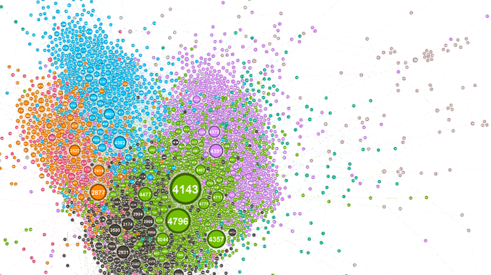 Netzwerkanalyse von Forschungsbeiträgen zu Sustainability Accounting Themen; segmentiert nach Forschungsclustern (Farbe) und gerankt nach Bedeutung (Grösse) auf Basis der Referenzierungen