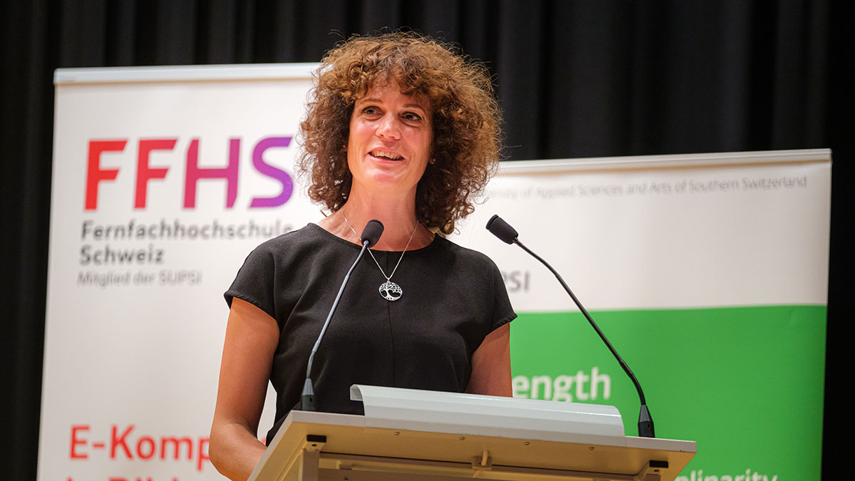 Die Veranstaltung wurde unter der Einhaltung der Zertifikatspflicht durchgeführt. Gastrednerin Tanja Fux, Chefin der Dienststelle für Berufsbildung des Kantons Wallis, gratulierte den Studierenden und auch der FFHS für die stetig steigenden Studierendenzahlen und ihre Leistung in den letzten Jahren.