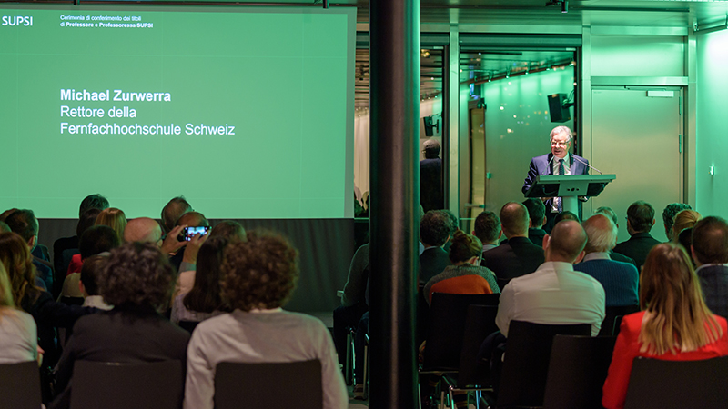 Die Laudationen von SUPSI-Direktor Franco Gervasoni, den Departementsvorstehenden der SUPSI und vom Rektor der FFHS, Michael Zurwerra, hoben die Bedeutsamkeit der Titelvergaben hervor. Sie seien ein Zeichen für die Qualität der Schule in Bezug auf die Wissenschaft, Forschung, Lehre und Weiterentwicklung. Als «wichtige Vertreter der gesamten SUPSI und der FFHS» bezeichnete Michael Zurwerra die nun offiziell ernannten FFHS-Professorinnen und Professoren: