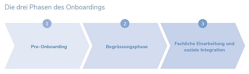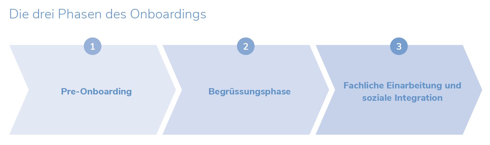 Das Ziel des Onboardings neuer Mitarbeitenden ist simpel: Sie lernen bei ihrem Eintritt in die Firma die Einstellungen, Kenntnisse, Fähigkeiten und Verhaltensweisen kennen, die erforderlich sind, um möglichst schnell effektiv tätig zu sein. Kurz gesagt: Ein erfolgreiches Onboarding trägt dazu bei, dass die Neuen ihren Job möglichst schnell möglichst gut machen können. Erfolgreiches Onboarding ist also mehr als eine Seelenmassage für neue Mitarbeitende, die den Einstieg erleichtert. Es hat einen sehr handfesten finanziellen Hintergrund. Der ganze Prozess gliedert sich in drei Phasen (siehe dazu auch untenstehende Grafik):