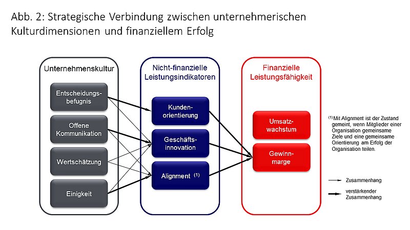 - Entscheidungsbefugnis, (2) offene Kommunikation, (3) Wertschätzung der Mitarbeitenden und (4) unternehmerische Einigkeit in direktem, teilweise verstärkendem Zusammenhang mit den zukünftigen Leistungsindikatoren (A) Kundenorientierung, (B) Geschäftsinnovation und (C) Alignment stehen.