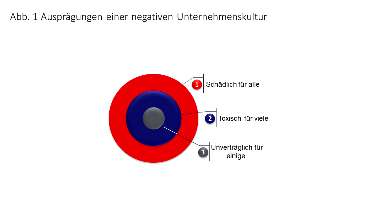 Jede Gruppe, und somit jede Organisation, entwickelt – implizit oder explizit – und pflegt im Alltag ein Verständnis der Realität, das zum Ausdruck bringt, was sie für wichtig und erstrebenswert, aber auch für unerwünscht und unwichtig hält. Es sind diese Werte, Annahmen und Überzeugungen, die – neben hierarchischen Machtstrukturen – das Verhalten und die Verhältnisse innerhalb einer Organisation prägen. Es stellt sich nun die Frage, ob es berechtigt sei, diese positive Konnotation der Unternehmenskultur zu hinterfragen. Wir sind davon überzeugt und schlagen drei Ausprägungen einer negativen Unternehmenskultur vor: