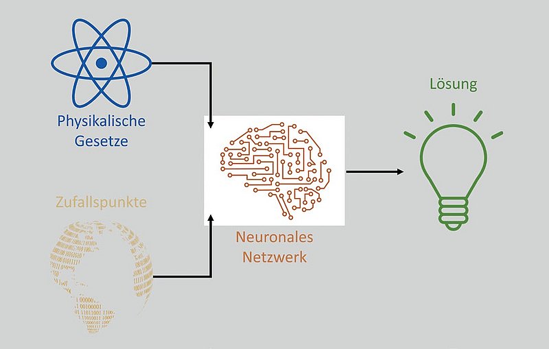 Ein alternatives Paradigma zur Lösung von partiellen Differentialgleichungen wurde in den 1990ern vorgeschlagen und in den letzten Jahren wieder belebt. Dieser Ansatz basiert auf der Verwendung eines Werkzeugs der künstlichen Intelligenz: den neuronalen Netzwerken. Diese basieren auf kleinen Einheiten (Neuronen). Die Neuronen verarbeiten die Eingangssignale in Abhängigkeit von justierbaren Parametern und werden miteinander in einem Netz verbunden, um eine quantitative Verarbeitung von Eingängen in passenden Ausgängen als Funktion von passenden Parametern zu ermöglichen. Die Komplexität dieser Verarbeitung erfolgt aufbauend mittels mehrerer Schichten von solchen Neuronen. Diese Struktur führt dazu, dass solche Netze eine Beziehung zwischen Eingängen und Ausgängen aus einem Datensatz «lernen» können. Das heisst, sie können anhand einer passenden Stichprobe von Beispielwerten am Ein- und Ausgang eine Funktion lernen. Zudem kann man bei neuronalen Netzwerken stetige Differenzen exakt berechnen, ohne auf finite Differenzen ausweichen zu müssen. Diese Eigenschaften charakterisieren neuronale Netzwerke als perfekte Kandidaten, um die Lösung von einer gewissen Differentialgleichung zu lernen, indem sie so trainiert werden, dass die Bedingung, die durch die Differenzialgleichung bestimmt ist, bei ausgewählten Eingangswerten möglichst gut erfüllt wird. Dank des systematischen Einsatzes von neuronalen Netzwerken im ständig wachsenden Bereich von Data Science gibt es heutzutage viele benutzerfreundliche dedizierte Bibliotheken, die ein Wiederbeleben von diesem Ansatz zur Lösung von Differentialgleichungen gefördert hat.