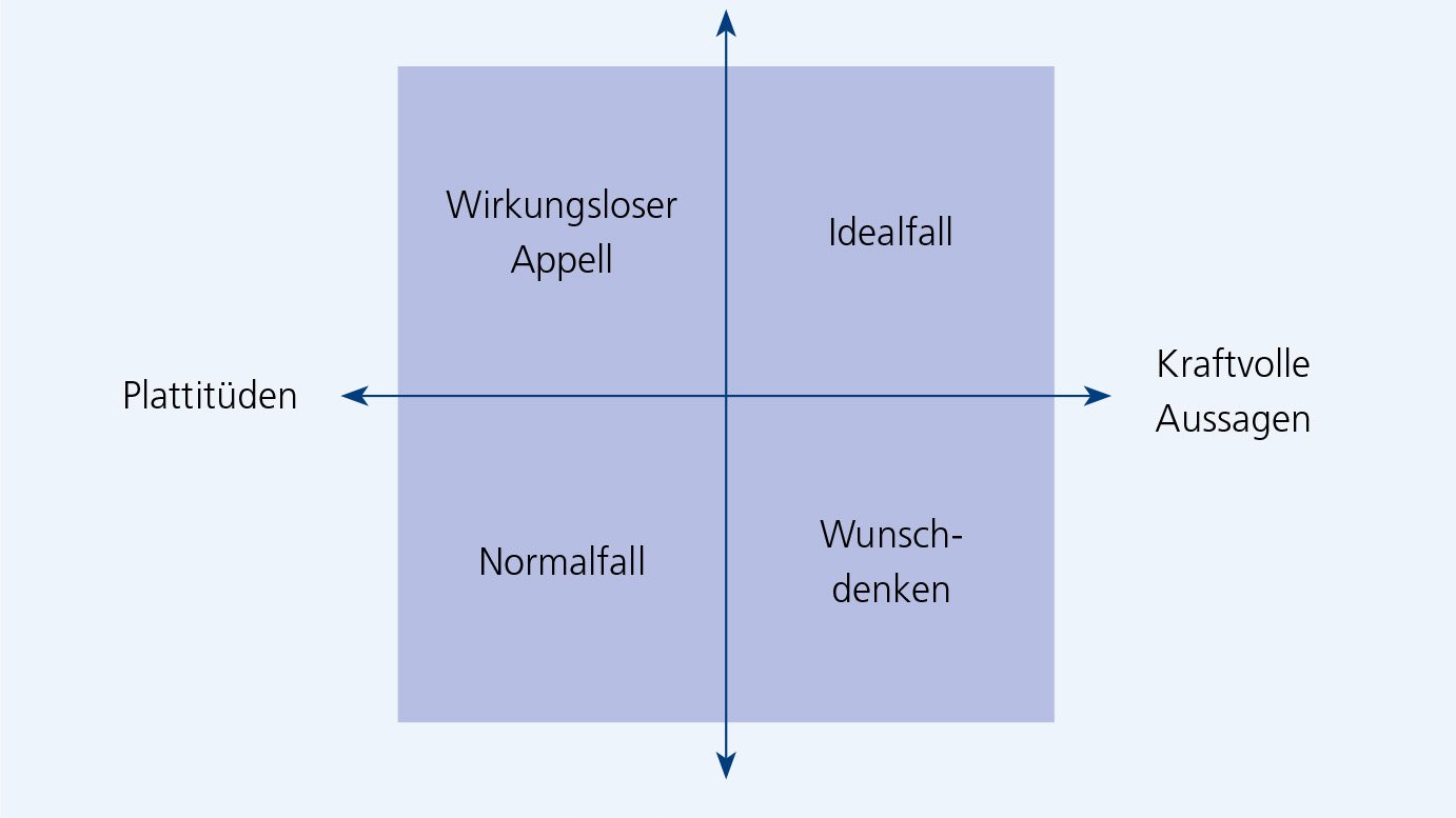 Das Selbstverständliche in einer schmucken Art formulieren: Wenn eine Bank bekundet, dass sie «die finanziellen Bedürfnisse der Kunden innovativ und nachhaltig befriedigt» oder «die zukunftsträchtige Drehscheibe für Finanztransaktionen» sein will, formuliert sie mit der Vision aus Sicht der Kunden reine Selbstverständlichkeiten. Was sollte sie denn sonst tun? Ihr Angebot als rückständig und von kurzer Dauer gestalten? Oder was für Kundenbedürfnisse sollte sie sonst befriedigen als die finanziellen? Sie ist eben eine Bank! Dasselbe gilt für zahlreiche Organisationen, wie für den Chemiekonzern BASF, der festhält: «Wir sind ‹The Chemical Company› und arbeiten erfolgreich auf allen wichtigen Märkten», oder Pharmaunternehmungen, die versprechen, die Lebensqualität der Patienten zu verbessern: Sie alle adressieren Basisanforderungen, die wir als Kunden schlichtweg erwarten und bei deren Nichterfüllung wir maximal enttäuscht wären.