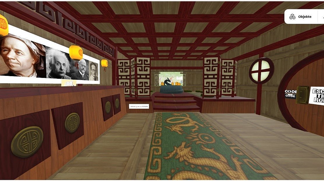 So sieht ein digitaler Escape Room aus: Nur wer die Forschung Albert Einsteins und vier anderer Wissenschaftler kennt, kann aus dem chinesischen Zimmer entkommen. Screenshot: Mozilla-Hubs Escape Room «Chinesisches Zimmer»