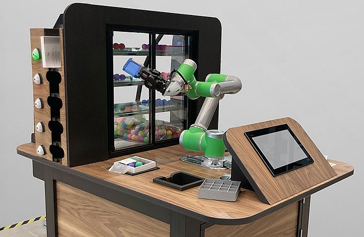 Der Chocobot macht Schokoladenträume wahr. Der Roboter stellt jedem Kunden seine ganz persönliche Pralinébox zusammen. Sobald der Kunde die gewünschte Verpackung und seine Lieblingspralinen auf dem Display ausgewählt hat, tritt er in Aktion und konfektioniert die Schachteln mit den süssen Leckereien aus dem Kühlregal. Das Besondere: Der Chocobot ist ein kollaborativer Roboter, ein sogenannter Cobot.