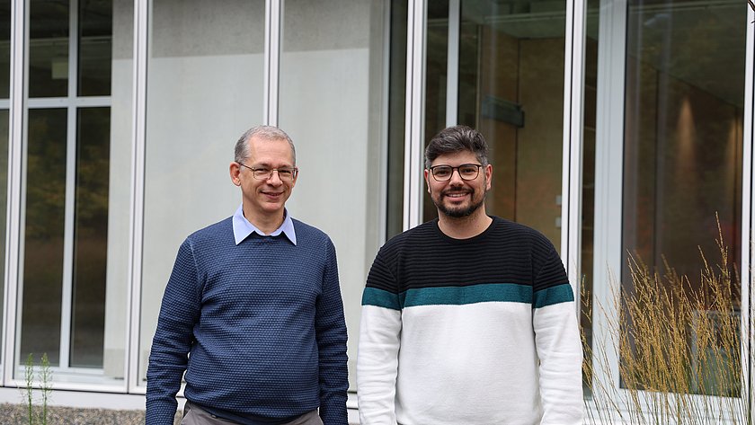Paulo Antonio Pasqual Jùnior, Forscher an der brasilianischen Universidade de Caxias do SUL (UCS) gemeinsam mit Prof. Dr. Egon Werlen von der FFHS vor dem Hauptsitz Campus Brig.