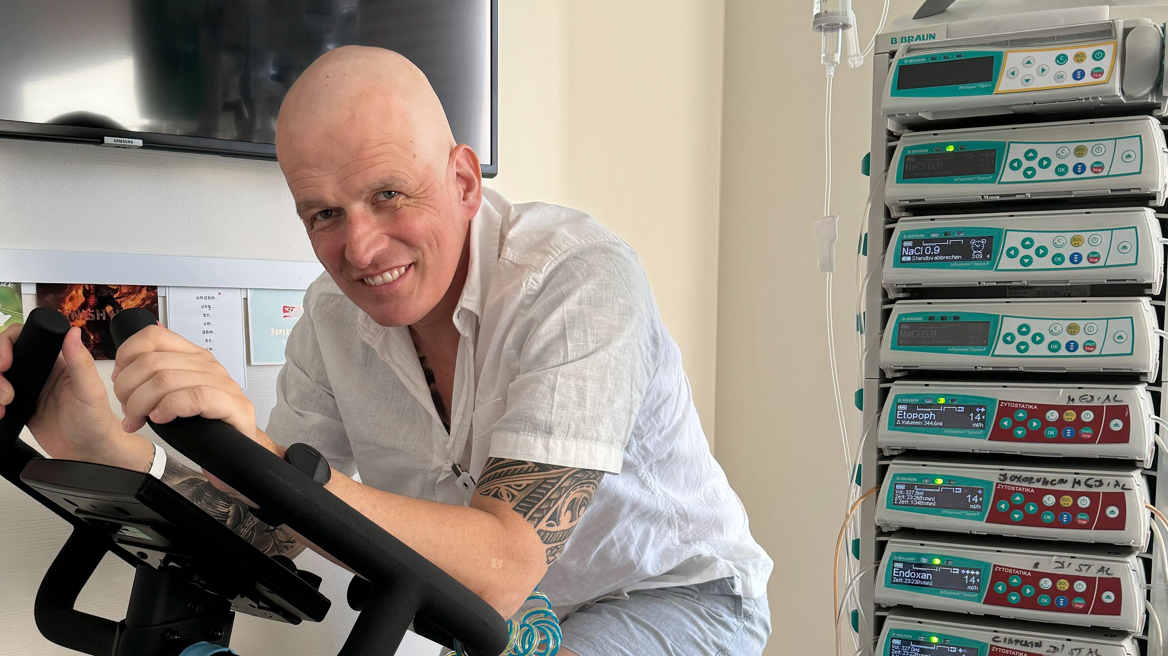 «Bis zu diesem Tag war ich nie länger als zwei Tage krankheitsbedingt abwesend. Das gab es bei mir nicht», sagt Sascha. Nun jedoch hat der Krebs die Kontrolle über sein Leben übernommen und er musste seine Geschäftstätigkeit auf Eis legen. Sascha folgte seinem Leitsatz und akzeptierte, was er nicht ändern kann. Was er aber tun kann, ist kämpfen. Und kämpfen heisst in seiner Situation vor allem Erdulden. Fort- und Rückschritte ertragen. Knochenmarkkrebs kann je nach Art mit einer Lebenserhaltungstherapie unter Kontrolle gehalten werden, im besten Fall für zehn, im schlechteren für drei Jahre. Bei ihm sieht es eher nach letzterem aus. Sascha lässt eine, wie er sie nennt, «Atombombentherapie» über sich ergehen, eine hoch dosierte Chemotherapie in vier Zyklen. Damit ist er an der obersten Grenze des Aushaltbaren. Während sein Körper schwach wird, wächst die Stärke in seinem Kopf.