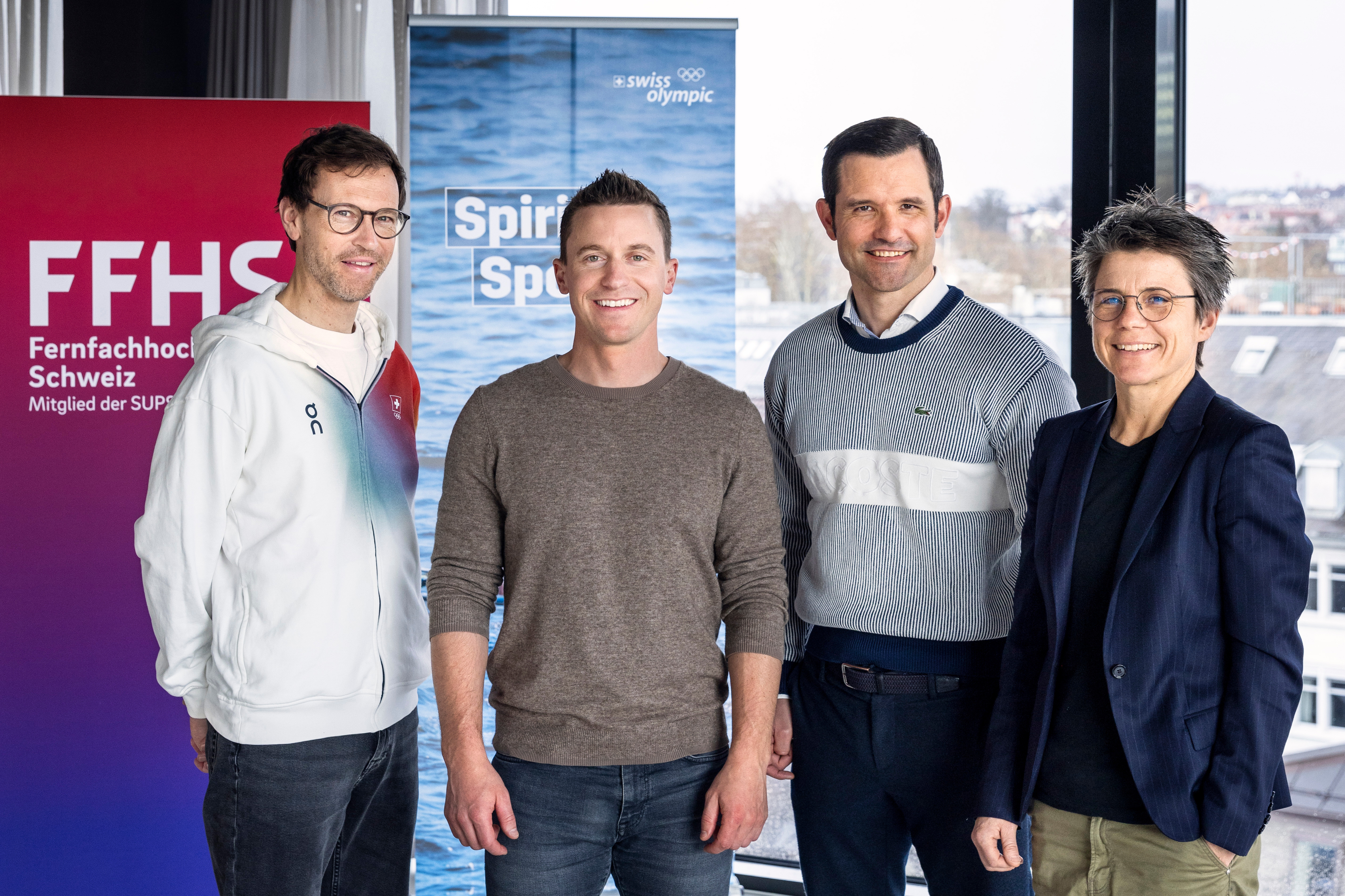 Von links: Simon Niepmann, Laufbahnberater Swiss Olympic Athlete Hub, Nevin Galmarini, Koordinator Spitzensport und Studium FFHS Mike Kurt, Repräsentant Corporate Relations FFHS, Maja Neuenschwander, Leiterin Swiss Olympic Athlete Hub. (Foto: Dominic Steinmann)