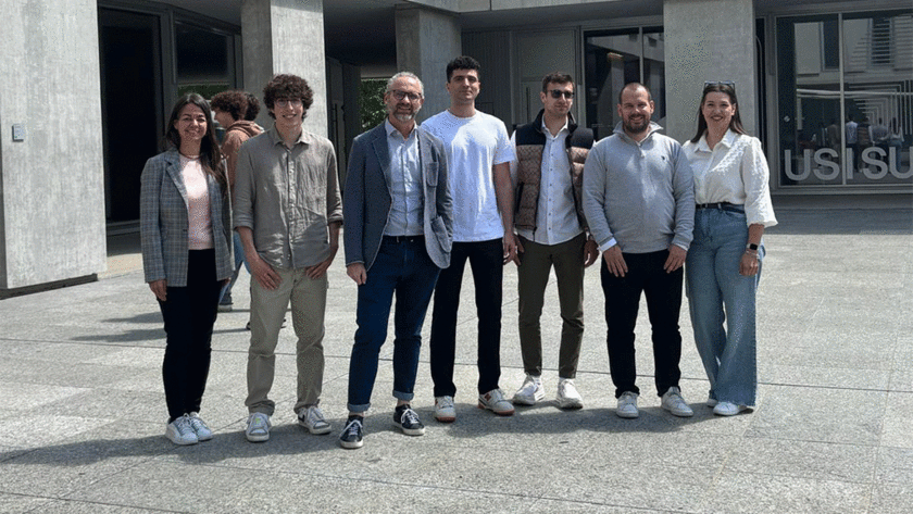 Martha Velasco, Koordinatorin Arbeitsgruppe Nachhaltigkeit FFHS, Stefano Tritelli, Student SUPSI, Alessandro Fontana, Senior-Dozent und Forscher SUPSI, Riccardo Giolo, Student SUPSI, Riccardo Scuderi, Student SUPSI, Claude Caminada, Betriebsmanager Campus Zürich FFHS, Mirjana Bojic, Betriebsmitarbeiterin Campus Zürich FFHS (von links nach rechts)