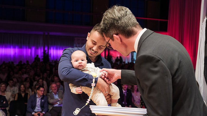 Vereinbarkeit von Familie und Studium: FFHS-Rektor Prof. Dr. Marc Schnyder gratuliert. (Fotos: Christian Pfammatter)