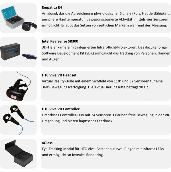 Unsere Geräte ermöglichen die Gestaltung und Umsetzung von virtuellen (Lern-)Umgebungen, in denen eine oder mehrere Personen an einer Aufgabe arbeiten können. Wir untersuchen das Potenzial von VR im Fernunterricht. Mit Hilfe von Eye-Trackern können wir feststellen, wo und wie lange die Lernenden auf Lehrmaterial – meist auf Bildschirme - schauen, um Konzepte wie Aufmerksamkeit, kognitive Belastung und andere kognitiv-affektive Zustände zu messen. Ähnlich wie das Eye-Tracking gibt uns das Mouse-Tracking die Möglichkeit, kognitive und emotionale Zustände im Zusammenhang mit dem Lernen zu untersuchen, wie z.B. Vertrauen, Aufmerksamkeit, Neugier, Interesse, Frustration, Langeweile oder Verwirrung.