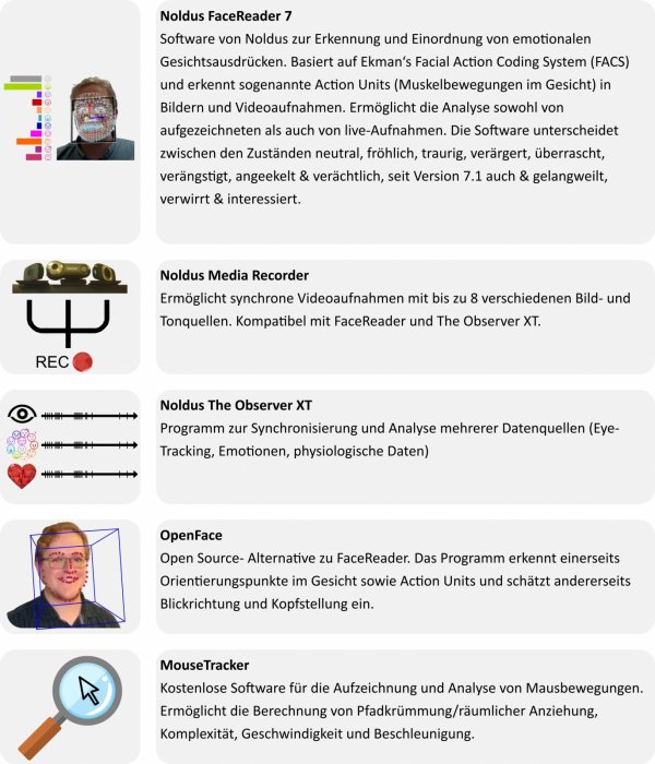In unseren Experimenten kombinieren wir verschiedene Messgeräte und Software. Dies ermöglicht uns, Verfahren mit hochsensiblen Messgeräten aus dem Labor (z.B. Eye-Tracking) auf den Lernalltag zu übertragen (z.B. anhand von Logfiles oder Mouse-Tracking). Auf diese Weise können wir Lernmaterialien verbessern und adaptive Kurse gestalten, die die Bedürfnisse von Studierenden und Dozierenden berücksichtigen, ohne die Lernprozesse zu beeinträchtigen.